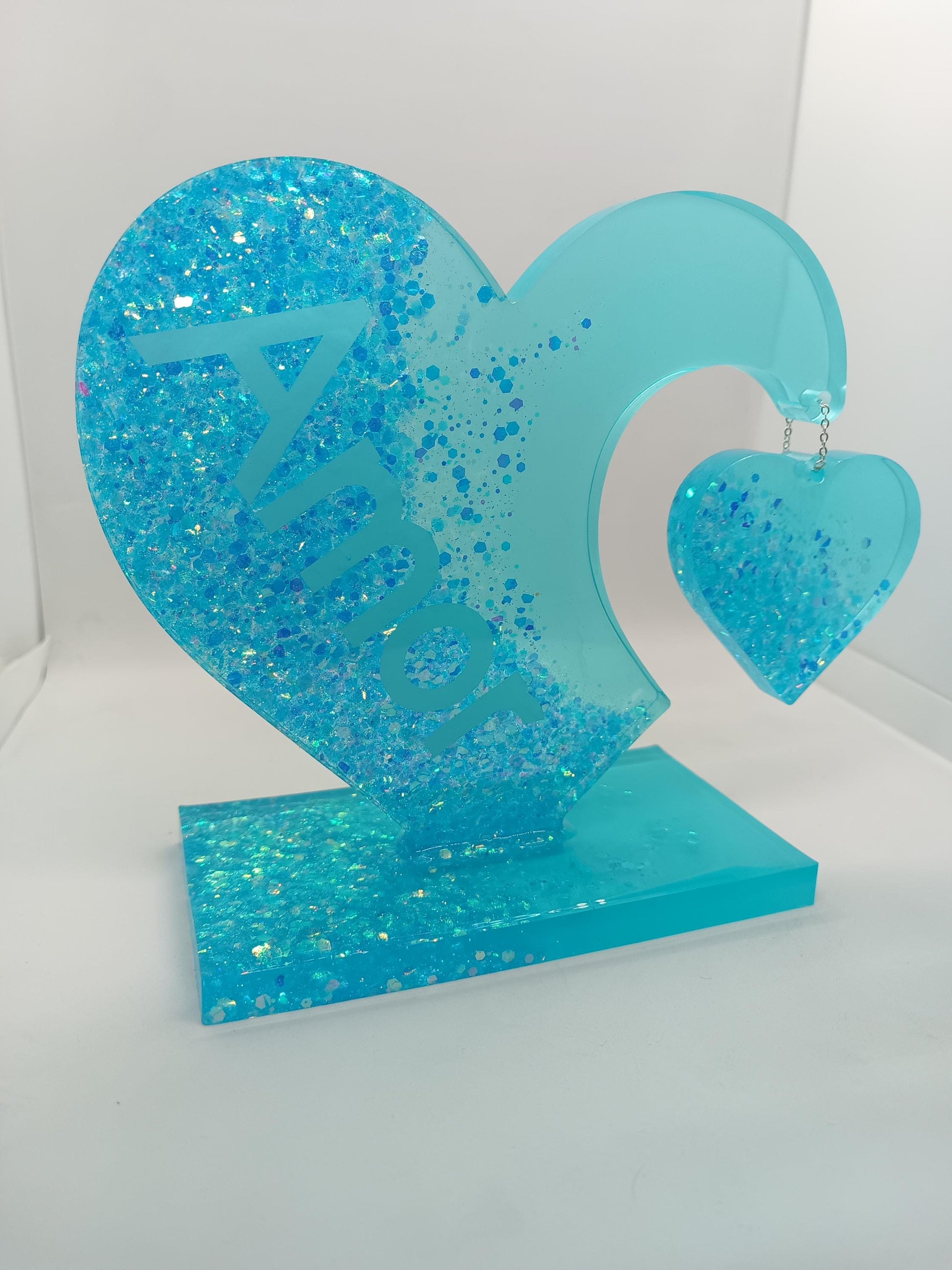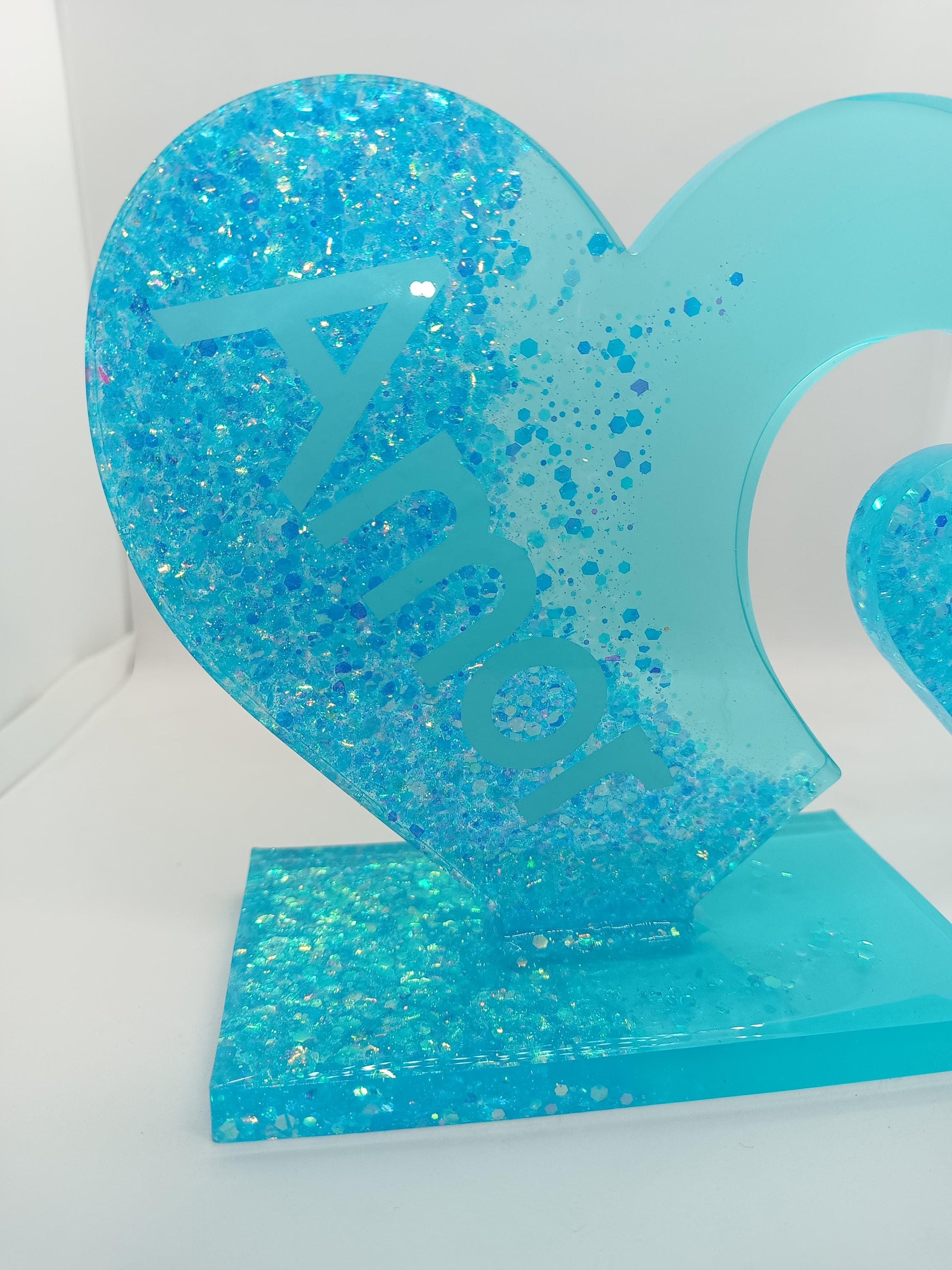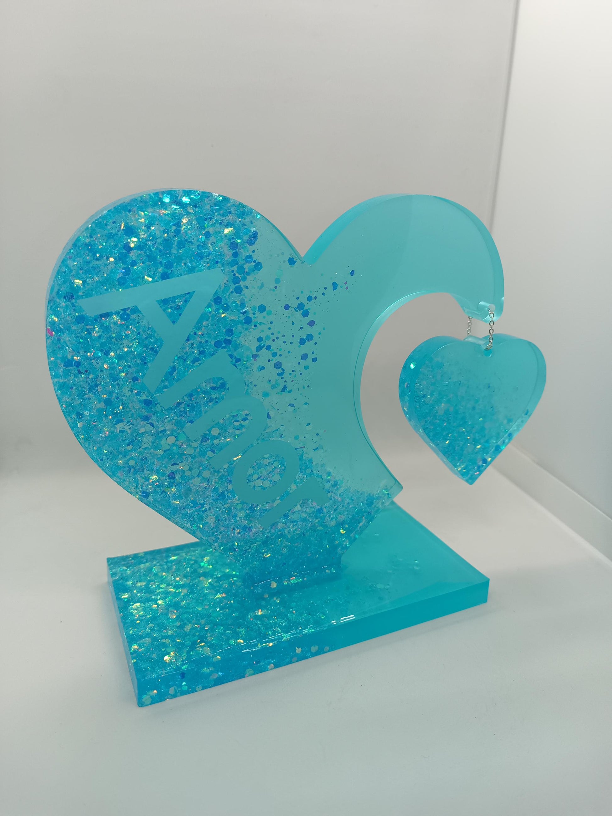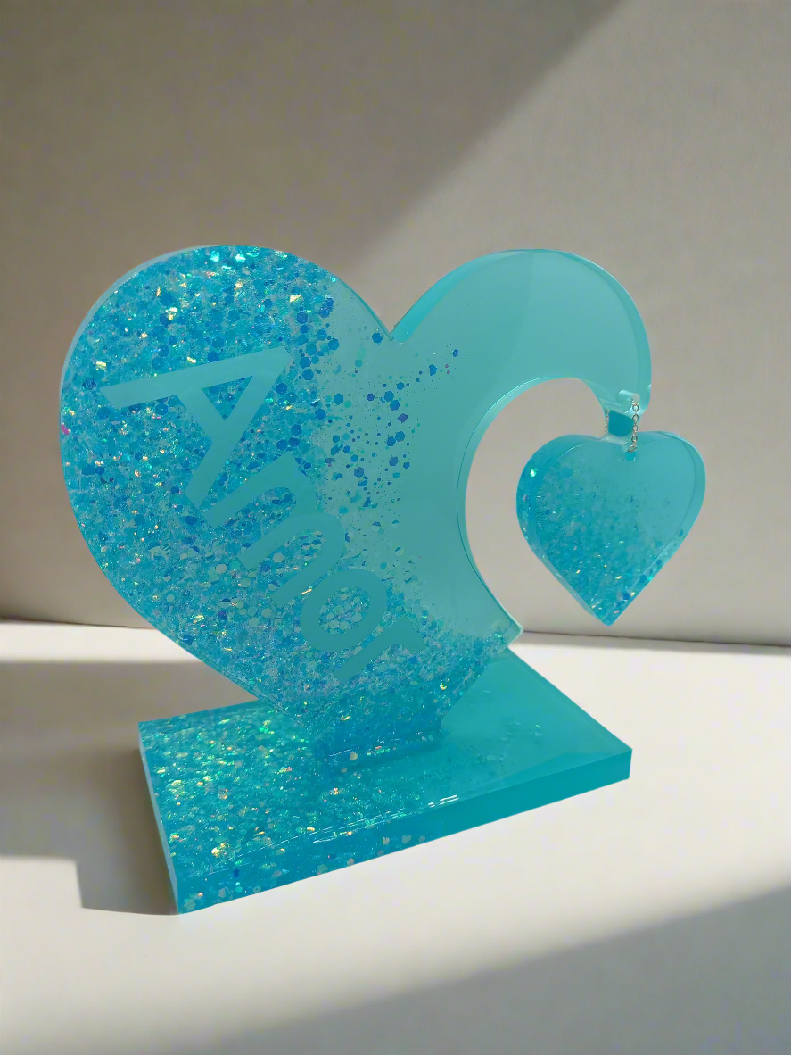 Deixe o seu amor brilhar com este coração de resina epoxy único! Cada peça é feita à mão, com um tom azul celeste vibrante e um brilho cintilante que captura a luz de forma mágica. A palavra "amor" esculpida no coração maior serve como um lembrete constante da beleza e da força desse sentimento.
